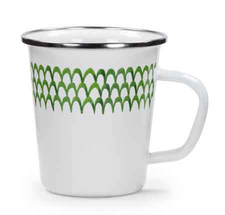 Golden Rabbit Enamelware Green Scallops Latte Mug has a 16 ounce capacity. Great for cocoa and specialty coffee. Heat resistant handle design. Stainless steel rim provides extra durability and a sophisticated look. Latte Mug stands 4.5" tall and has a 2.5" handle. Top diameter is 3.75"; bottom diameter is 2.75". This enamelware is made of carbon steel coated with porcelain enamel and trimmed with a stainless steel rim. Dishwasher safe, but dry promptly. Do not wash with hard water softeners or lemon based detergents- this will affect the finish. Do not soak. Enamelware is naturally non-stick and washes up with little effort. Do not use abrasives or scratch pads.The graphic designs on Golden Rabbit enamelware are fused into the enamel during the firing process and are covered with glass fritz that gives the piece a protective surface as well as a high gloss finish.Enamelware should not be used in the microwave. Made in Indonesia.