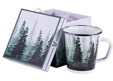 Golden Rabbit Forest Trees Latte Mug has a 16 ounce capacity. Great for cocoa and specialty coffee. Heat resistant handle design. Stainless steel rim provides extra durability and a sophisticated look. Comes with a beautiful, nature inspired gift box. Latte Mug stands 4.5 inches tall and has a 2.5 inch handle. Top diameter is 3.75 inches; bottom diameter is 2.75 inches. This enamelware is made of carbon steel coated with porcelain enamel and trimmed with a stainless steel rim. Oven and broiler safe to 500 degrees. Dishwasher safe, but dry promptly. Do not wash with hard water softeners or lemon based detergents- this will affect the finish. Do not soak. Enamelware is naturally non-stick and washes up with little effort. Do not use abrasives or scratch pads. The graphic designs on Golden Rabbit enamelware are fused into the enamel during the firing process and are covered with glass fritz that gives the piece a protective surface as well as a high gloss finish. Enamelware should not be used in the microwave. Made in Indonesia.
