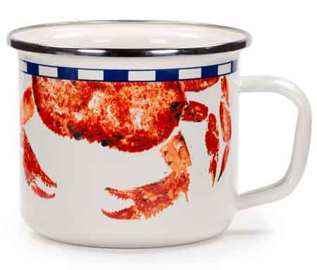 Golden Rabbit Crab House Collection Grande Soup Mug has a 24 ounce capacity. Great for soup or large cups of cocoa and coffee. Heat resistant handle design. Stainless steel rim provides extra durability and a sophisticated look.Crab graphics on the outside with a white interior. 4.75" diameter and stands 3.75"H.This enamelware is made of carbon steel coated with porcelain enamel and trimmed with a stainless steel rim. Oven and broiler safe to 500 degrees. Dishwasher safe, but dry promptly. Do not wash with hard water softeners or lemon based detergents- this will affect the finish. Do not soak. Enamelware is naturally non-stick and washes up with little effort. Do not use abrasives or scratch pads.The graphic designs on Golden Rabbit enamelware are fused into the enamel during the firing process and are covered with glass fritz that gives the piece a protective surface as well as a high gloss finish. Enamelware should not be used in the microwave. Made in Indonesia.