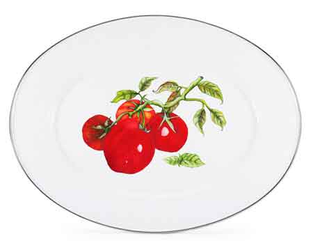 One Golden Rabbit Enamelware Tomatoes Collection Oval Serving Platter. The platter measures 16" X 12".This enamelware is made of carbon steel coated with porcelain enamel and trimmed with a stainless steel rim. Dishwasher safe, but dry promptly. Do not wash with hard water softeners or lemon based detergents- this will affect the finish. Do not soak. Enamelware is naturally non-stick and washes up with little effort. Do not use abrasives or scratch pads.The graphic designs on Golden Rabbit enamelware are fused into the enamel during the firing process and are covered with glass fritz that gives the piece a protective surface as well as a high gloss finish.Enamelware should not be used in the microwave. Made in Indonesia.