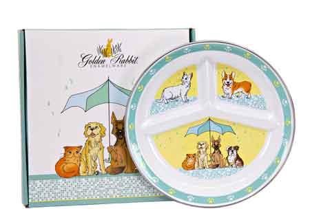 Golden Rabbit Enamelware Raining Cats & Dogs 9" divided toddler plate