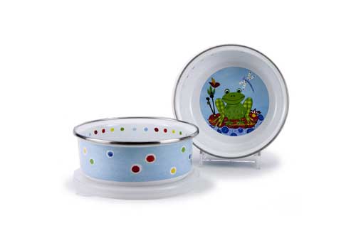 This childrens dinnerware set is made of carbon steel coated with porcelain enamel and trimmed with a stainless steel rim. Pieces have a great resistance to chipping. Oven and broiler safe to 500 degrees. Dishwasher safe, but dry promptly. Do not wash with hard water softeners or lemon based detergents- this will affect the finish. Do not leave in standing water. Enamelware is naturally non-stick and washes up with little effort. Do not use abrasives or scratch pads.