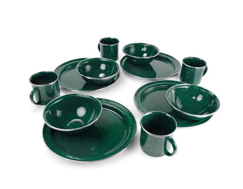 Stainless Steel Rim Green Pioneer Table Set, 12 Piece includes 4 of each of 12 oz. cups, 5.75" mixing bowls, and 10.375" dinner plates. Resembles traditional graniteware in classic speckled finish. Chip and scratch resistant. From GSI Outdoors enamelware collection. Dishwasher safe, do not use in the microwave. Perfect for indoors or out!